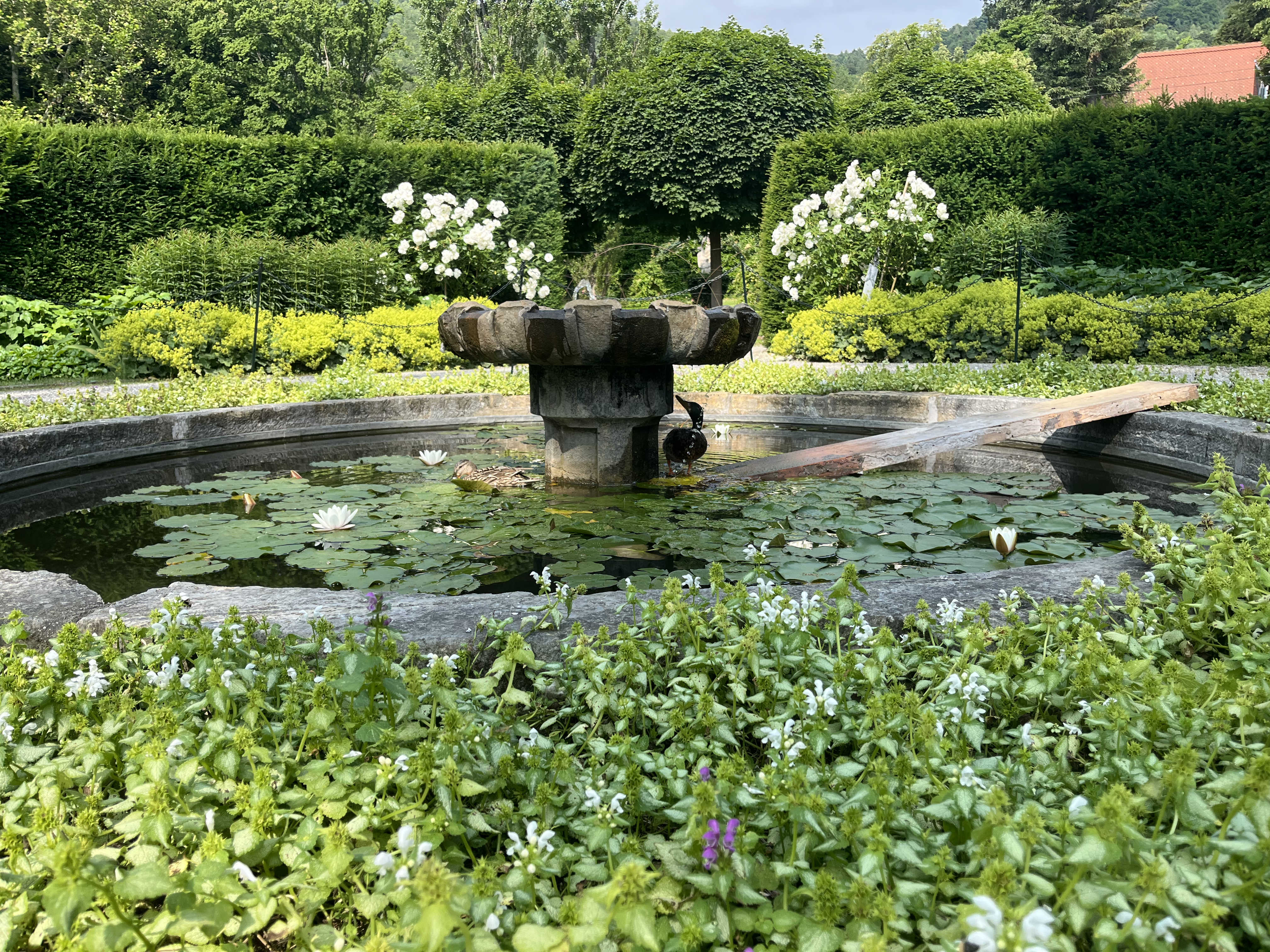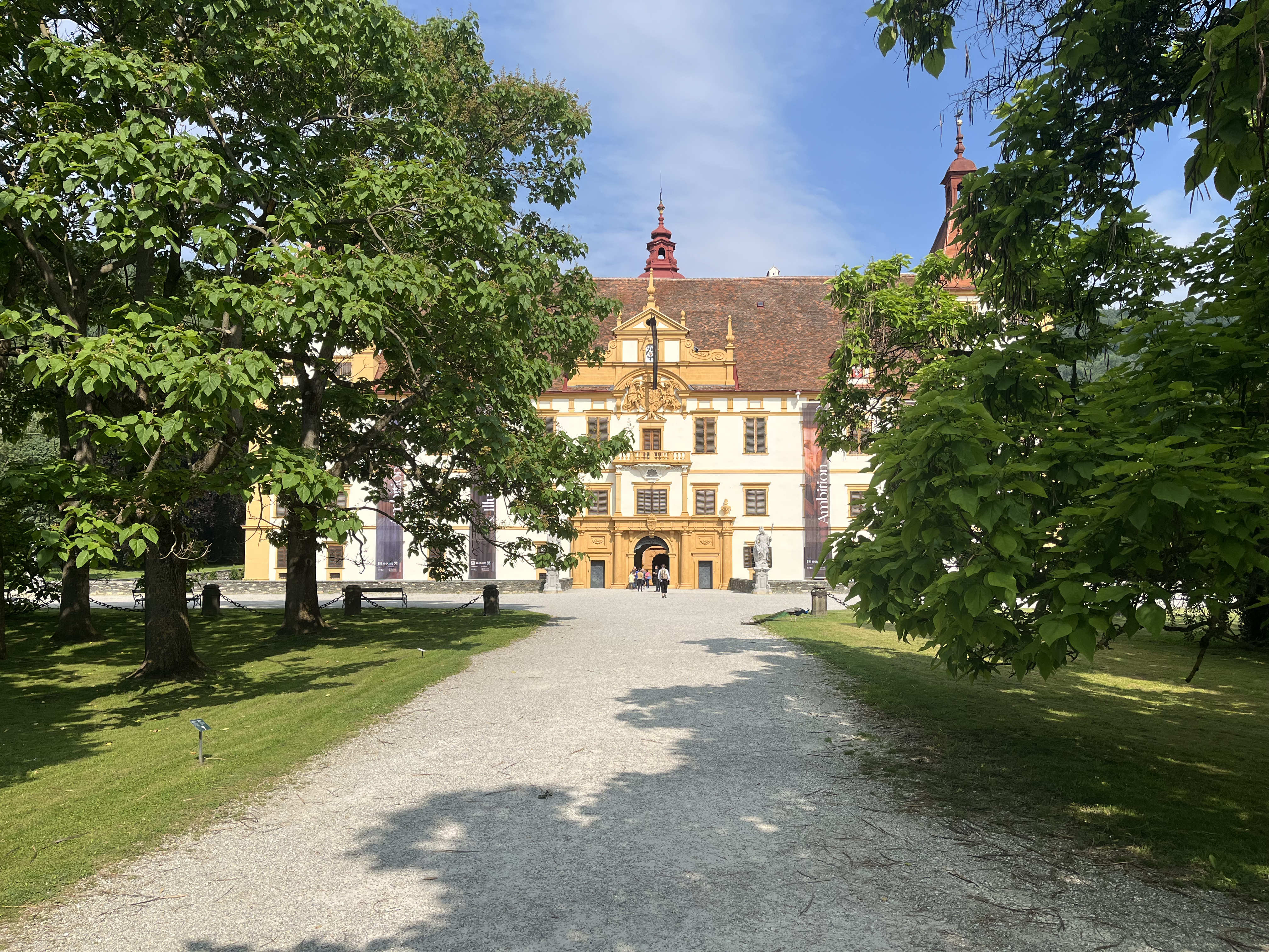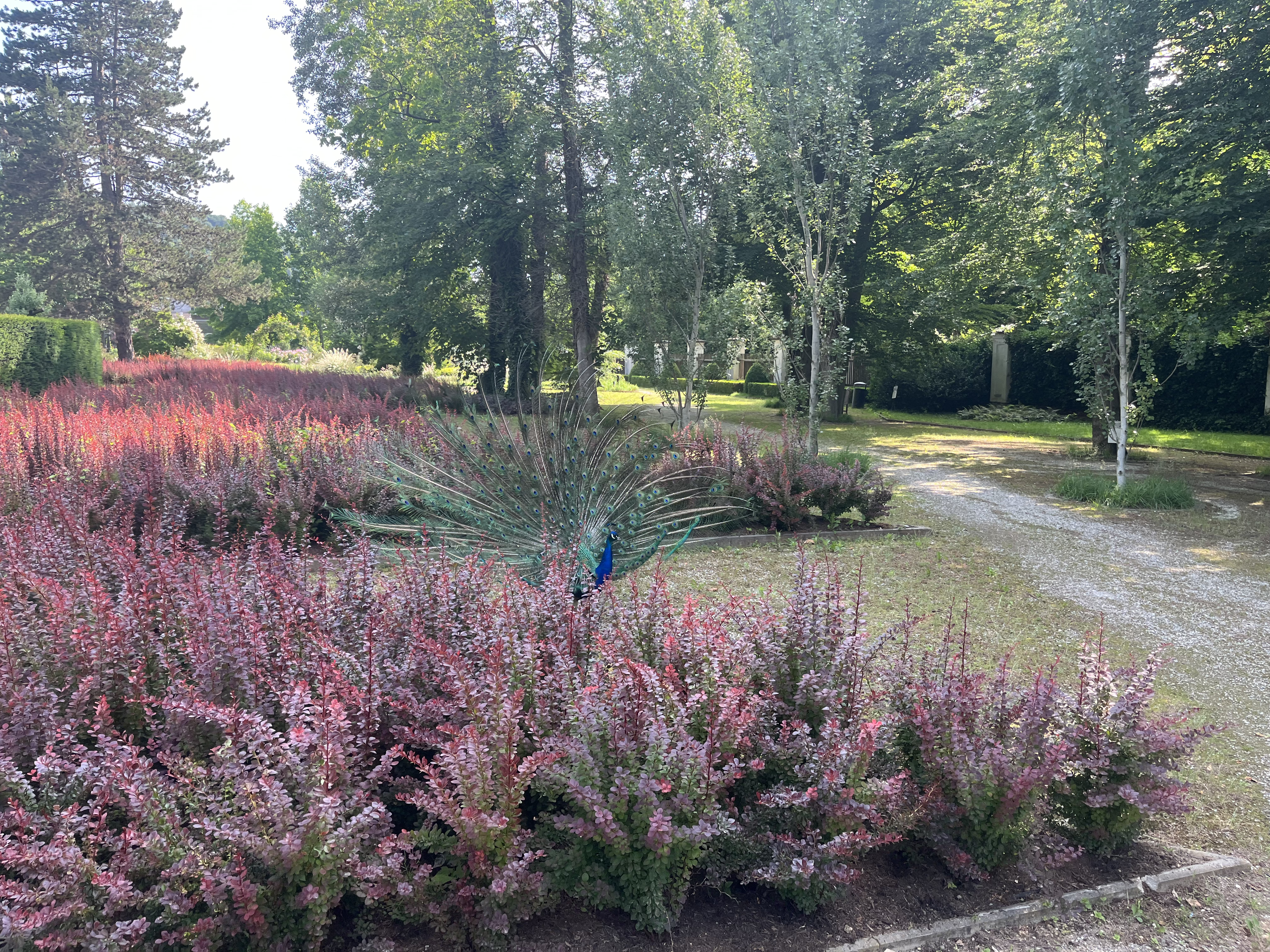 Der Kiesweg knirscht unter meinen Schritten, während ich mich dem prächtigen Eingangstor nähere. Mein Blick schweift über die Schlossfassade, die im weichen Nachmittagslicht wie gemalt wirkt. Ein Pfau schreitet anmutig über den Weg – seelenruhig, als sei er der heimliche Hausherr und hätte selbst eine Führung anzubieten.