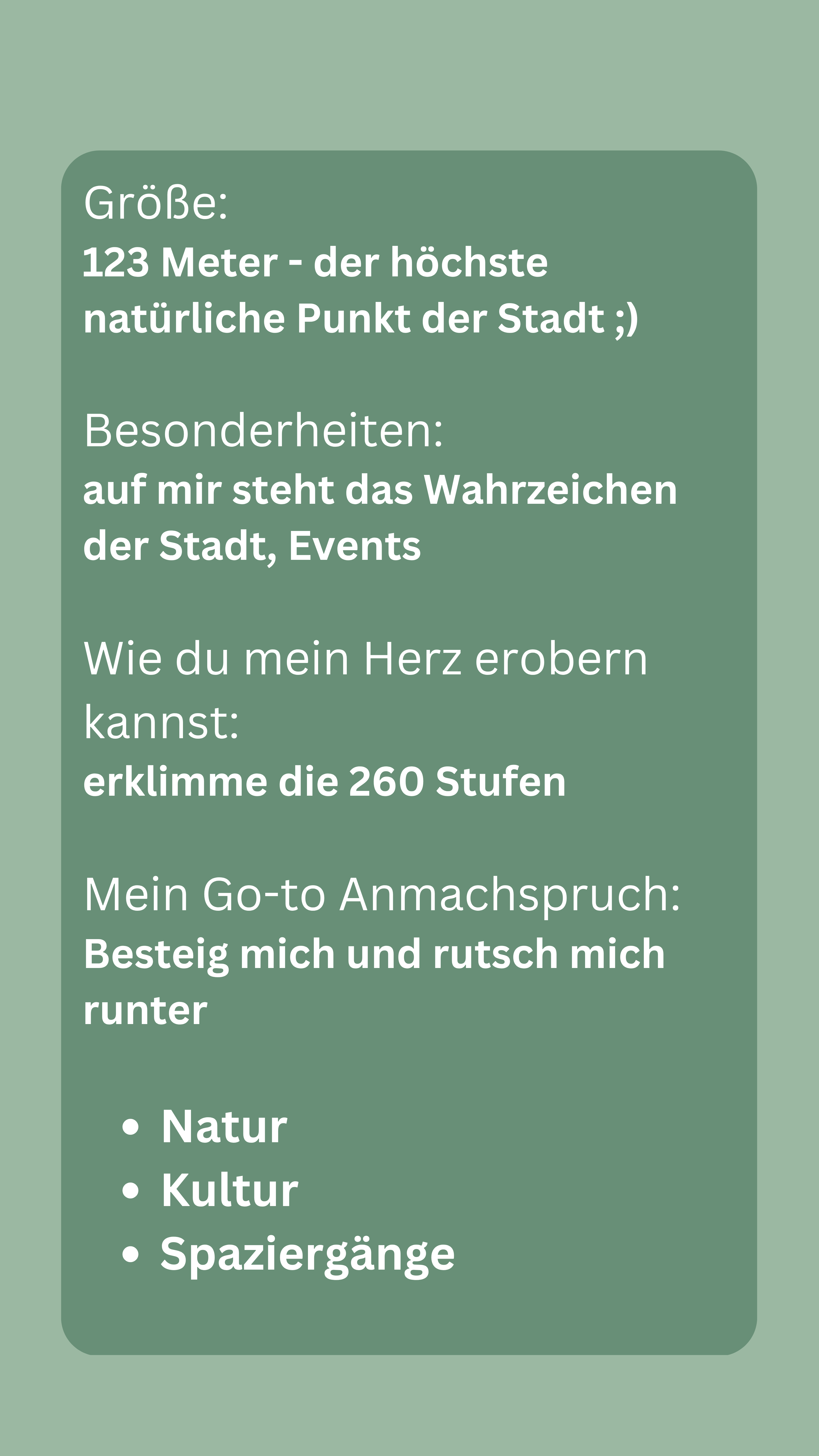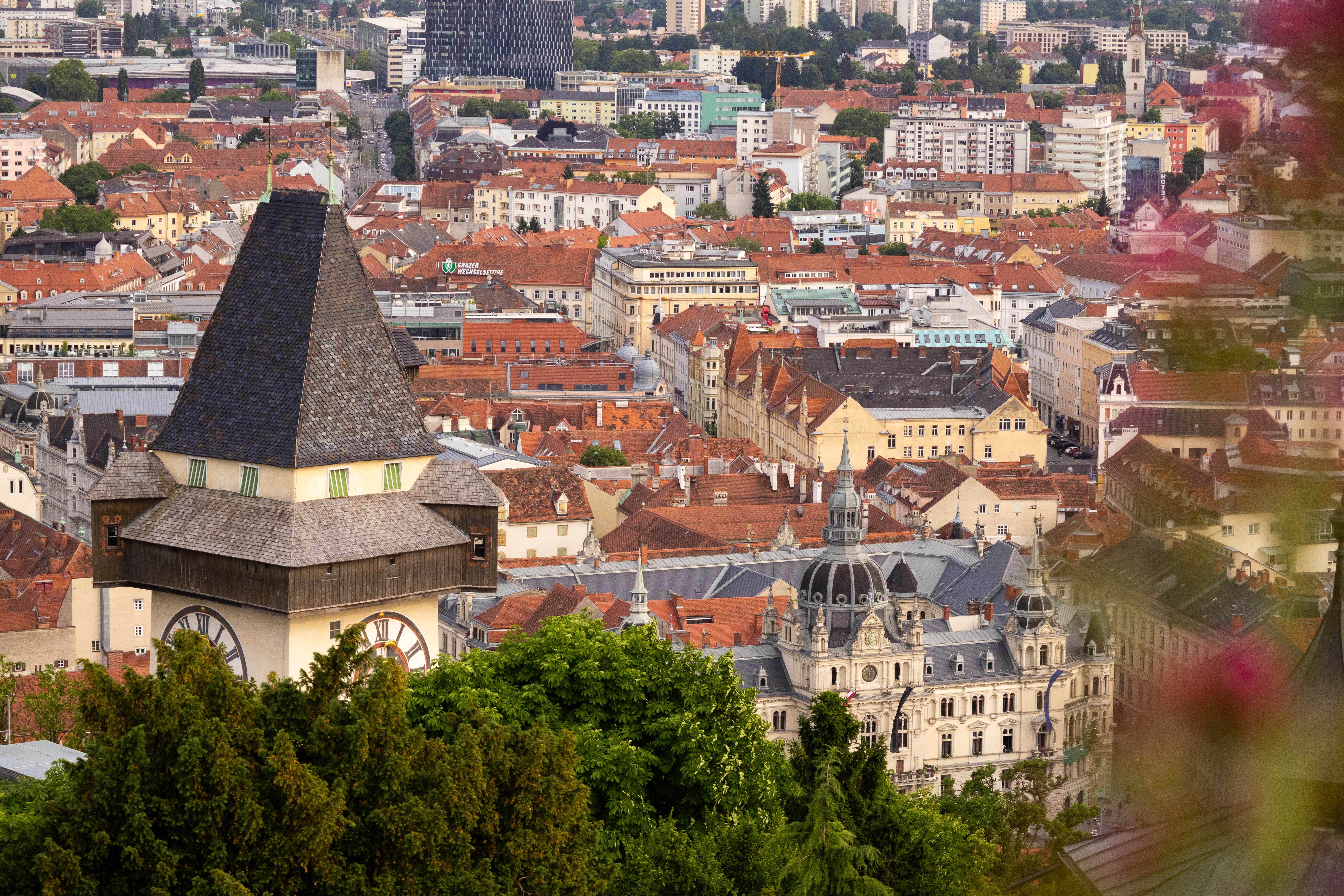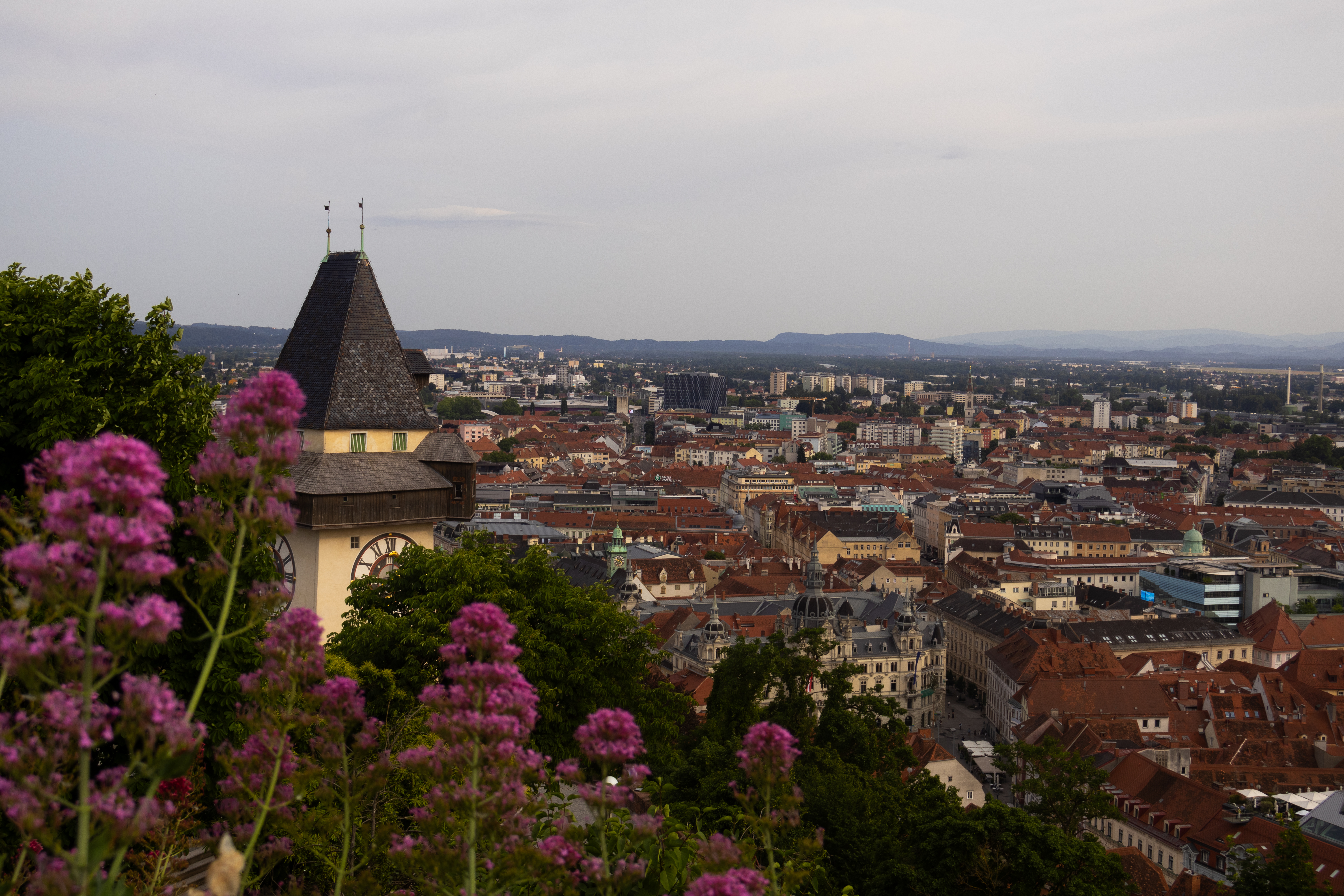 Mein Herz schlägt heftig, ich versuche meinen Atem zu beruhigen. Nur noch 60 Stufen – 200 habe ich schon hinter mir. Ein Schritt nach dem anderen. Meine Beine brennen, doch ich gebe nicht auf. Dann endlich: die letzte Stufe. Ich richte mich auf und hebe den Blick: Zwischen steinernen Wegen und alten Mauern liegen bunte Blumenbeete und grüne Wiesen. Und direkt vor mir: der Uhrturm, das stolze Wahrzeichen von Graz.