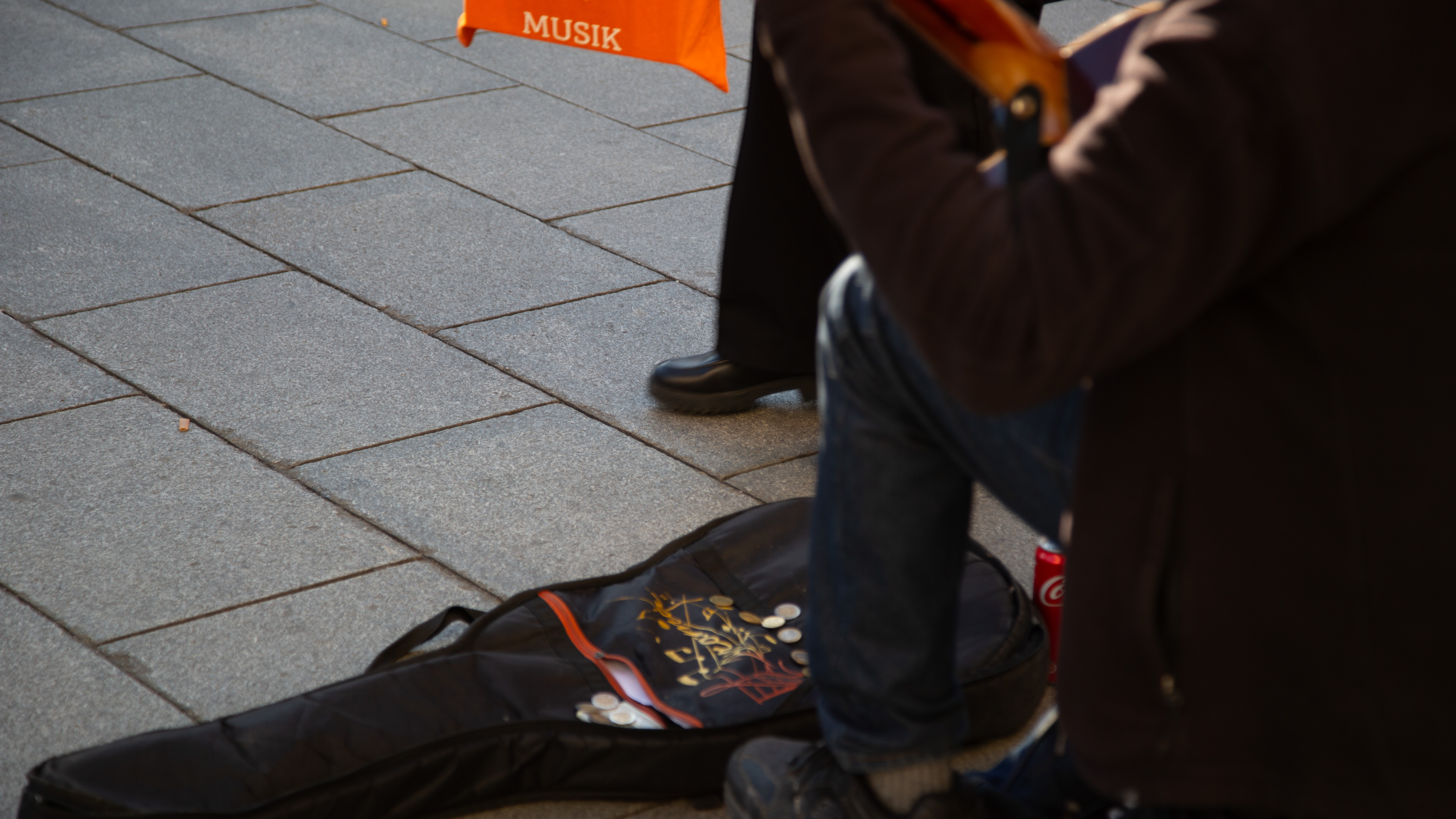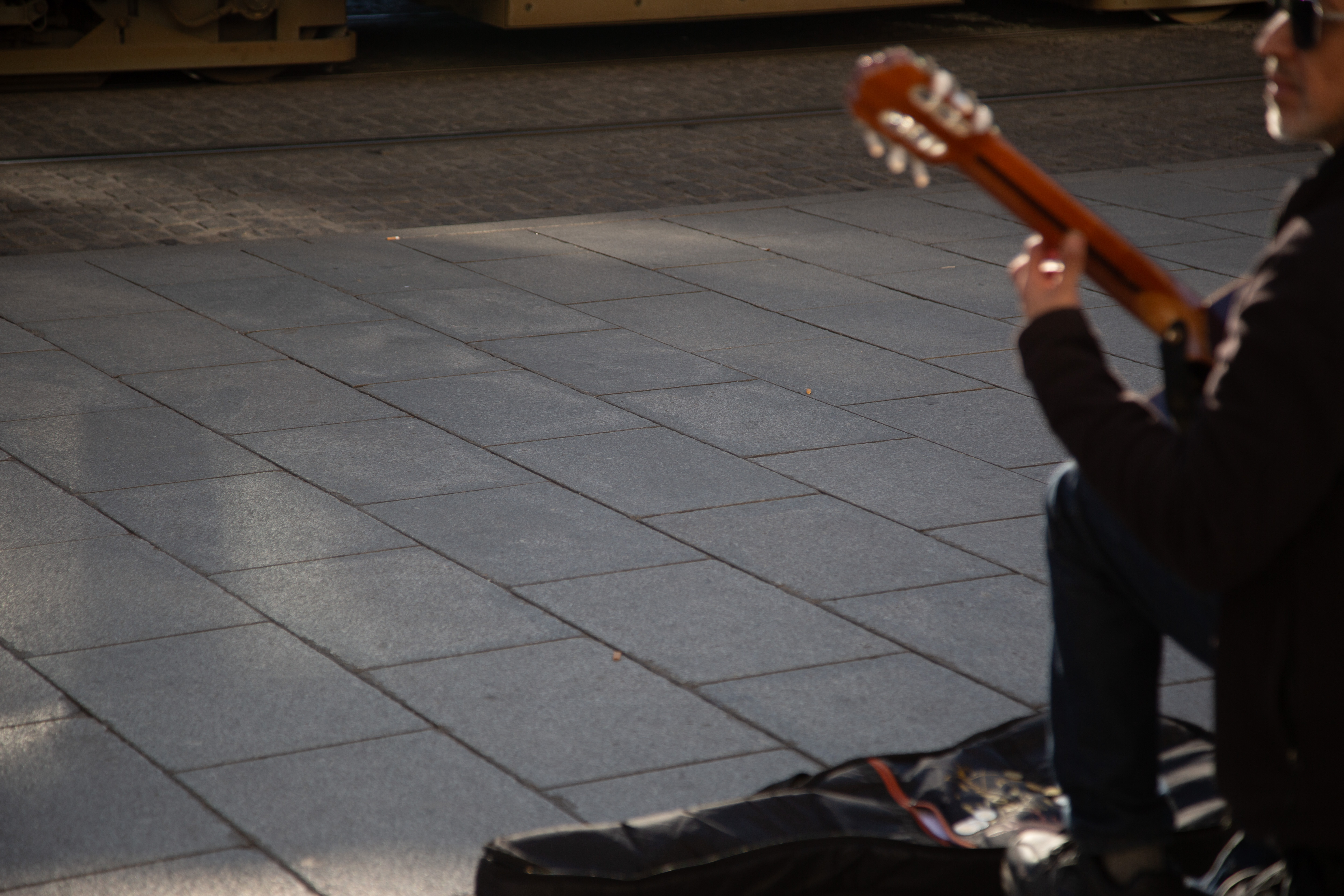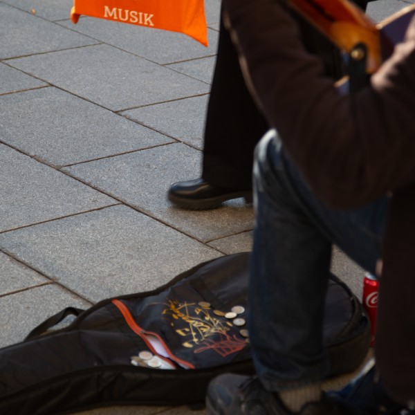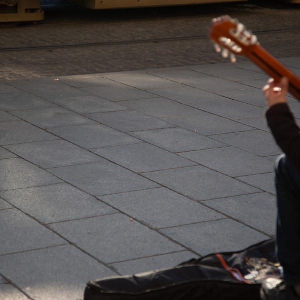 Ruhige Gitarren-Klänge zwischen eilenden Schritten. Die Weikhard-Uhr läutet. Licht. Die Abendsonne in der Sonnenbrille des lächelnden Musikers. Menschen kommen und gehen. Kinder schauen fasziniert zu ihm. Was ist sein Geheimnis?