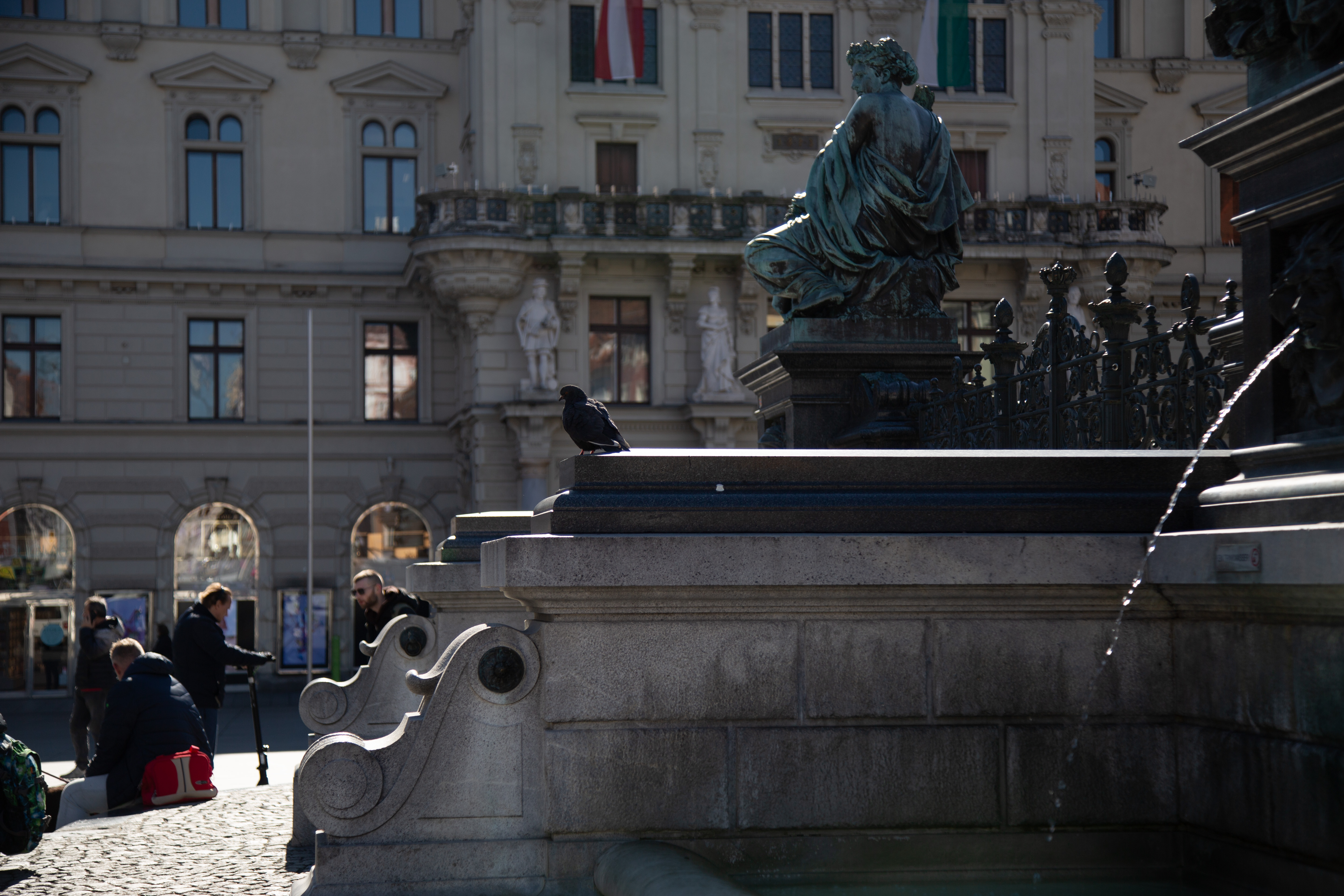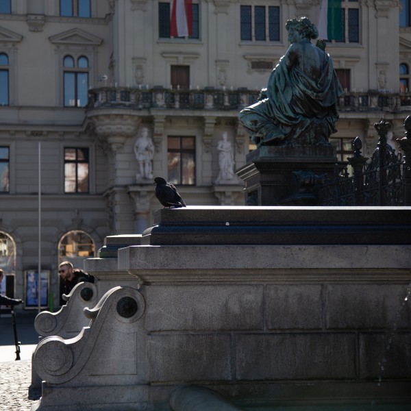Eine Taube, die sich sonnt. Viele Wege, die sich kreuzen. Manche verweilen, andere hasten vorbei. In der Mitte ein Brunnen. Wasser plätschert aus historischen Figuren – die Konstante im wirren Klanggeschehen, wenn der Hauptplatz lebt.